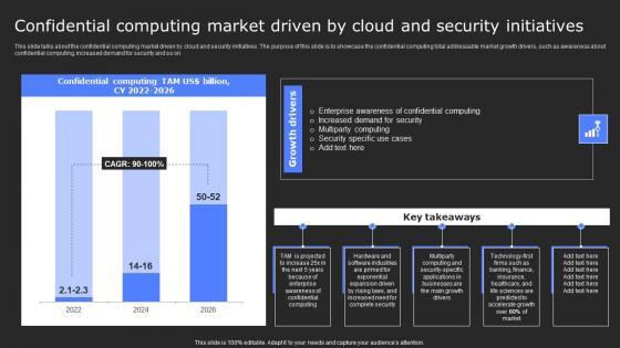 This slide talks about the confidential computing market driven by cloud and security initiatives. The purpose of this slide is to showcase the confidential computing total addressable market growth drivers, such as awareness about confidential computing, increased demand for security and so on. Find a pre-designed and impeccable Secure Computing Framework Confidential Computing Market Driven By Mockup Pdf. The templates can ace your presentation without additional effort. You can download these easy-to-edit presentation templates to make your presentation stand out from others. So, what are you waiting for Download the template from Slidegeeks today and give a unique touch to your presentation. This slide talks about the confidential computing market driven by cloud and security initiatives. The purpose of this slide is to showcase the confidential computing total addressable market growth drivers, such as awareness about confidential computing, increased demand for security and so on.