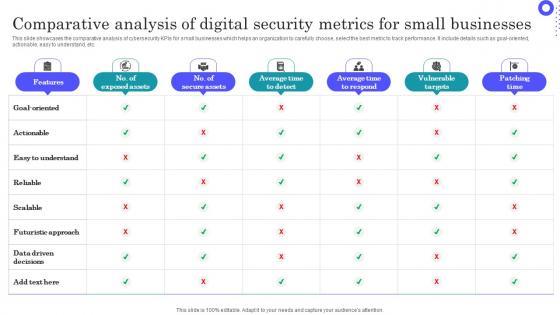 Pitch your topic with ease and precision using this Comparative Analysis Of Digital Security Metrics For Small Businesses Icons Pdf This layout presents information on Futuristic Approach, Data Driven Decisions, Exposed Assets It is also available for immediate download and adjustment. So, changes can be made in the color, design, graphics or any other component to create a unique layout. This slide showcases the comparative analysis of cybersecurity KPIs for small businesses which helps an organization to carefully choose, select the best metric to track performance. It include details such as goal oriented, actionable, easy to understand, etc.