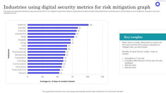 Showcasing this set of slides titled Industries Using Digital Security Metrics For Risk Mitigation Graph Inspiration Pdf The topics addressed in these templates are Evaluates Effectiveness, Most Common, Key Insights All the content presented in this PPT design is completely editable. Download it and make adjustments in color, background, font etc. as per your unique business setting. This slide showcases the industries using cybersecurity KPI for risk mitigation graph which helps an organization to protect sensitive data and enhances customer trust. It include details such as healthcare, education, consumer, entertainment, etc.