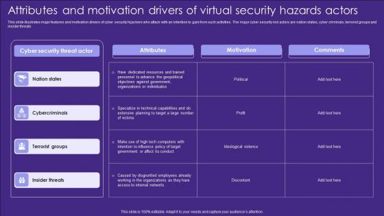 This slide illustrates major features and motivation drivers of cyber security hijackers who attack with an intention to gain from such activities. The major cyber security risk actors are nation states, cyber criminals, terrorist groups and insider threats Showcasing this set of slides titled Attributes And Motivation Drivers Of Virtual Security Hazards Actors Designs Pdf. The topics addressed in these templates are Attributes, Motivation, Comments. All the content presented in this PPT design is completely editable. Download it and make adjustments in color, background, font etc. as per your unique business setting. This slide illustrates major features and motivation drivers of cyber security hijackers who attack with an intention to gain from such activities. The major cyber security risk actors are nation states, cyber criminals, terrorist groups and insider threats