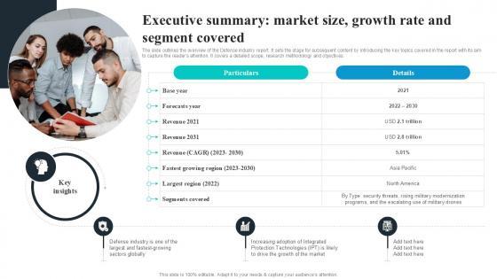 The slide outlines the overview of the Defense industry report. It sets the stage for subsequent content by introducing the key topics covered in the report with its aim to capture the readers attention. It covers a detailed scope, research methodology and objectives. Find highly impressive Executive Summary Market Size Growth Rate Global Security Industry PPT Presentation IR SS V on Slidegeeks to deliver a meaningful presentation. You can save an ample amount of time using these presentation templates. No need to worry to prepare everything from scratch because Slidegeeks experts have already done a huge research and work for you. You need to download Executive Summary Market Size Growth Rate Global Security Industry PPT Presentation IR SS V for your upcoming presentation. All the presentation templates are 100 percent editable and you can change the color and personalize the content accordingly. Download now The slide outlines the overview of the Defense industry report. It sets the stage for subsequent content by introducing the key topics covered in the report with its aim to capture the readers attention. It covers a detailed scope, research methodology and objectives.