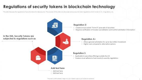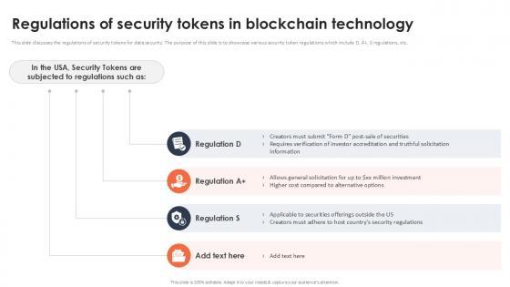 This slide discusses the regulations of security tokens for data security. The purpose of this slide is to showcase various security token regulations which include D, A, S regulations, etc. Find a pre-designed and impeccable Regulations Of Security Tokens In Blockchain Technology Securing Your Data Ppt Slide The templates can ace your presentation without additional effort. You can download these easy-to-edit presentation templates to make your presentation stand out from others. So, what are you waiting for Download the template from Slidegeeks today and give a unique touch to your presentation. This slide discusses the regulations of security tokens for data security. The purpose of this slide is to showcase various security token regulations which include D, A, S regulations, etc.