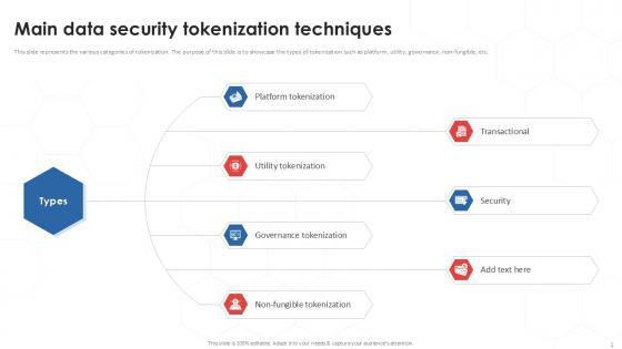 This slide represents the various categories of tokenization. The purpose of this slide is to showcase the types of tokenization such as platform, utility, governance, non-fungible, etc. Boost your pitch with our creative Main Data Security Tokenization Techniques PPT Powerpoint. Deliver an awe-inspiring pitch that will mesmerize everyone. Using these presentation templates you will surely catch everyones attention. You can browse the ppts collection on our website. We have researchers who are experts at creating the right content for the templates. So you do not have to invest time in any additional work. Just grab the template now and use them. This slide represents the various categories of tokenization. The purpose of this slide is to showcase the types of tokenization such as platform, utility, governance, non-fungible, etc.