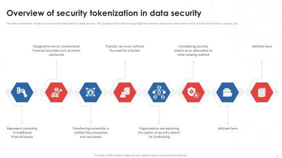 This slide outlines the introduction of security tokenization in data security. The purpose of this slide is to highlight the overview of security tokenization which include the definition, purpose, etc. This Overview Of Security Tokenization In Data Security Securing Your Data Ppt Sample from Slidegeeks makes it easy to present information on your topic with precision. It provides customization options, so you can make changes to the colors, design, graphics, or any other component to create a unique layout. It is also available for immediate download, so you can begin using it right away. Slidegeeks has done good research to ensure that you have everything you need to make your presentation stand out. Make a name out there for a brilliant performance. This slide outlines the introduction of security tokenization in data security. The purpose of this slide is to highlight the overview of security tokenization which include the definition, purpose, etc.