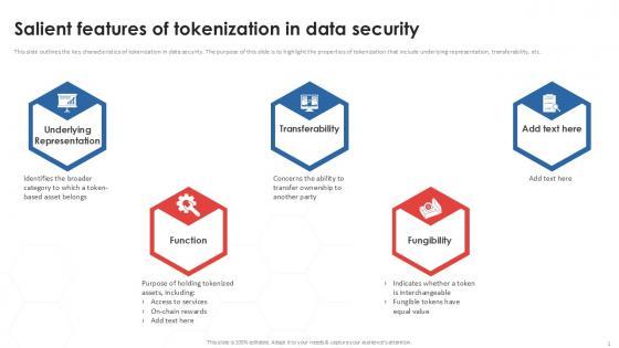 This slide outlines the key characteristics of tokenization in data security. The purpose of this slide is to highlight the properties of tokenization that include underlying representation, transferability, etc. Boost your pitch with our creative Salient Features Of Tokenization In Data Security PPT Sample. Deliver an awe-inspiring pitch that will mesmerize everyone. Using these presentation templates you will surely catch everyones attention. You can browse the ppts collection on our website. We have researchers who are experts at creating the right content for the templates. So you do not have to invest time in any additional work. Just grab the template now and use them. This slide outlines the key characteristics of tokenization in data security. The purpose of this slide is to highlight the properties of tokenization that include underlying representation, transferability, etc.