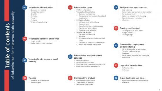 Boost your pitch with our creative Table Of Contents Of Tokenization For Improved Data Security PPT Sample. Deliver an awe-inspiring pitch that will mesmerize everyone. Using these presentation templates you will surely catch everyones attention. You can browse the ppts collection on our website. We have researchers who are experts at creating the right content for the templates. So you do not have to invest time in any additional work. Just grab the template now and use them. Our Table Of Contents Of Tokenization For Improved Data Security PPT Sample are topically designed to provide an attractive backdrop to any subject. Use them to look like a presentation pro.