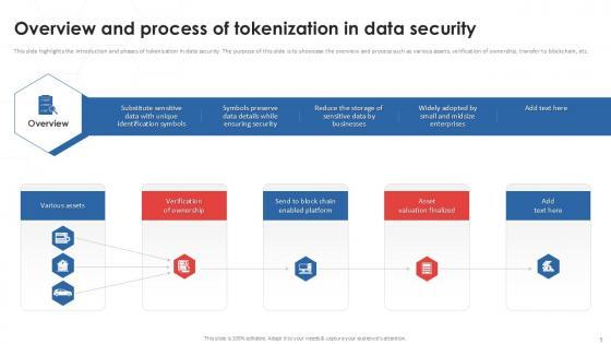 This slide highlights the introduction and phases of tokenization in data security. The purpose of this slide is to showcase the overview and process such as various assets, verification of ownership, transfer to blockchain, etc. Find a pre-designed and impeccable Overview And Process Of Tokenization In Data Security PPT Example. The templates can ace your presentation without additional effort. You can download these easy-to-edit presentation templates to make your presentation stand out from others. So, what are you waiting for Download the template from Slidegeeks today and give a unique touch to your presentation. This slide highlights the introduction and phases of tokenization in data security. The purpose of this slide is to showcase the overview and process such as various assets, verification of ownership, transfer to blockchain, etc.