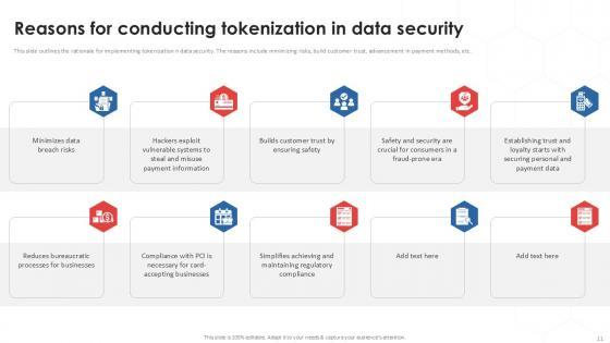 This slide outlines the rationale for implementing tokenization n data security. The reasons include minimizing risks, build customer trust, advancement in payment methods, etc. Do you know about Slidesgeeks Reasons For Conducting Tokenization In Data Security Securing Your Data Ppt Presentation These are perfect for delivering any kind od presentation. Using it, create PowerPoint presentations that communicate your ideas and engage audiences. Save time and effort by using our pre-designed presentation templates that are perfect for a wide range of topic. Our vast selection of designs covers a range of styles, from creative to business, and are all highly customizable and easy to edit. Download as a PowerPoint template or use them as Google Slides themes. This slide outlines the rationale for implementing tokenization n data security. The reasons include minimizing risks, build customer trust, advancement in payment methods, etc.