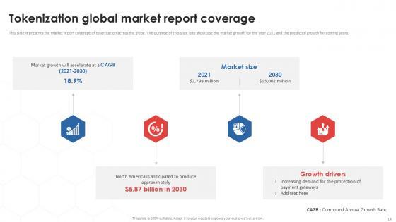 This slide represents the market report coverage of tokenization across the globe. The purpose of this slide is to showcase the market growth for the year 2021 and the predicted growth for coming years. Present like a pro with Tokenization Global Market Report Coverage Securing Your Data Ppt Slide Create beautiful presentations together with your team, using our easy-to-use presentation slides. Share your ideas in real-time and make changes on the fly by downloading our templates. So whether you are in the office, on the go, or in a remote location, you can stay in sync with your team and present your ideas with confidence. With Slidegeeks presentation got a whole lot easier. Grab these presentations today. This slide represents the market report coverage of tokenization across the globe. The purpose of this slide is to showcase the market growth for the year 2021 and the predicted growth for coming years.