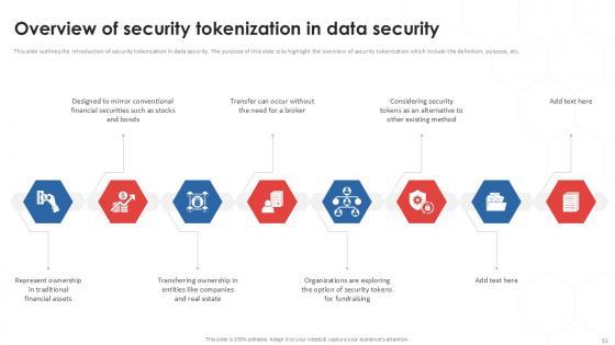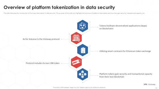 This slide discusses the introduction of first type tokenization in data security. The purpose of this slide is to highlight the overview of platform tokenization and how they gain security, transactional capacity, etc. Find a pre-designed and impeccable Overview Of Platform Tokenization In Data Security PPT Sample. The templates can ace your presentation without additional effort. You can download these easy-to-edit presentation templates to make your presentation stand out from others. So, what are you waiting for Download the template from Slidegeeks today and give a unique touch to your presentation. This slide discusses the introduction of first type tokenization in data security. The purpose of this slide is to highlight the overview of platform tokenization and how they gain security, transactional capacity, etc.