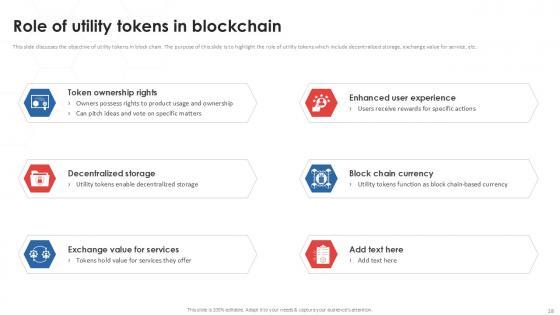 This slide discusses the objective of utility tokens in block chain. The purpose of this slide is to highlight the role of utility tokens which include decentralized storage, exchange value for service, etc. Create an editable Role Of Utility Tokens In Blockchain Securing Your Data Ppt Presentation that communicates your idea and engages your audience. Whether you are presenting a business or an educational presentation, pre-designed presentation templates help save time. Role Of Utility Tokens In Blockchain Securing Your Data Ppt Presentation is highly customizable and very easy to edit, covering many different styles from creative to business presentations. Slidegeeks has creative team members who have crafted amazing templates. So, go and get them without any delay. This slide discusses the objective of utility tokens in block chain. The purpose of this slide is to highlight the role of utility tokens which include decentralized storage, exchange value for service, etc.