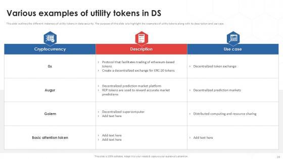 This slide outlines the different instances of utility tokens in data security. The purpose of this slide is to highlight the examples of utility tokens along with its description and use case. Crafting an eye-catching presentation has never been more straightforward. Let your presentation shine with this tasteful yet straightforward Various Examples Of Utility Tokens In Ds Securing Your Data Ppt Powerpoint template. It offers a minimalistic and classy look that is great for making a statement. The colors have been employed intelligently to add a bit of playfulness while still remaining professional. Construct the ideal Various Examples Of Utility Tokens In Ds Securing Your Data Ppt Powerpoint that effortlessly grabs the attention of your audience Begin now and be certain to wow your customers This slide outlines the different instances of utility tokens in data security. The purpose of this slide is to highlight the examples of utility tokens along with its description and use case.