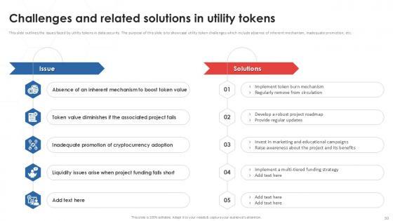 This slide outlines the issues faced by utility tokens in data security. The purpose of this slide is to showcase utility token challenges which include absence of inherent mechanism, inadequate promotion, etc. Boost your pitch with our creative Challenges And Related Tokenization Strategies For Data Security PPT Sample. Deliver an awe-inspiring pitch that will mesmerize everyone. Using these presentation templates you will surely catch everyones attention. You can browse the ppts collection on our website. We have researchers who are experts at creating the right content for the templates. So you do not have to invest time in any additional work. Just grab the template now and use them. This slide outlines the issues faced by utility tokens in data security. The purpose of this slide is to showcase utility token challenges which include absence of inherent mechanism, inadequate promotion, etc.