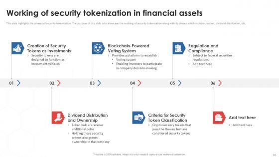 This slide highlights the phases of security tokenization. The purpose of this slide is to showcase the working of security tokenization along with its phases which include creation, dividend distribution, etc. Find a pre-designed and impeccable Working Of Security Tokenization In Financial Assets PPT Powerpoint. The templates can ace your presentation without additional effort. You can download these easy-to-edit presentation templates to make your presentation stand out from others. So, what are you waiting for Download the template from Slidegeeks today and give a unique touch to your presentation. This slide highlights the phases of security tokenization. The purpose of this slide is to showcase the working of security tokenization along with its phases which include creation, dividend distribution, etc.