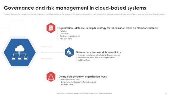This slide discusses the management and risk mitigation in cloud-based systems. The purpose of this slide is to showcase the elements on which tokenization depend, importance of governance and objectives of categorization. Boost your pitch with our creative Governance And Risk Tokenization Strategies For Data Security PPT Sample. Deliver an awe-inspiring pitch that will mesmerize everyone. Using these presentation templates you will surely catch everyones attention. You can browse the ppts collection on our website. We have researchers who are experts at creating the right content for the templates. So you do not have to invest time in any additional work. Just grab the template now and use them. This slide discusses the management and risk mitigation in cloud-based systems. The purpose of this slide is to showcase the elements on which tokenization depend, importance of governance and objectives of categorization.