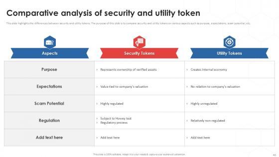 This slide highlights the differences between security and utility tokens. The purpose of this slide is to compare security and utility tokens on various aspects such as purpose, expectations, scam potential, etc. Find a pre-designed and impeccable Comparative Analysis Of Tokenization Strategies For Data Security PPT Template. The templates can ace your presentation without additional effort. You can download these easy-to-edit presentation templates to make your presentation stand out from others. So, what are you waiting for Download the template from Slidegeeks today and give a unique touch to your presentation. This slide highlights the differences between security and utility tokens. The purpose of this slide is to compare security and utility tokens on various aspects such as purpose, expectations, scam potential, etc.