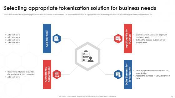 This slide discusses about choosing right tokenization solution for business needs. The purpose of this slide is to highlight the ways of selecting which include applicability to business, data elements, etc. There are so many reasons you need a Selecting Appropriate Tokenization Solution For Business Needs Securing Your Data Ppt Example The first reason is you can not spend time making everything from scratch, Thus, Slidegeeks has made presentation templates for you too. You can easily download these templates from our website easily. This slide discusses about choosing right tokenization solution for business needs. The purpose of this slide is to highlight the ways of selecting which include applicability to business, data elements, etc.