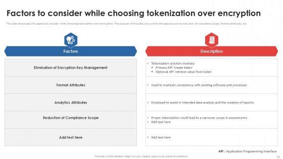 This slide outlines the rationale for implementing tokenization n data security. The reasons include minimizing risks, build customer trust, advancement in payment methods, etc. Boost your pitch with our creative Reasons For Conducting Tokenization In Data Security PPT Template. Deliver an awe-inspiring pitch that will mesmerize everyone. Using these presentation templates you will surely catch everyones attention. You can browse the ppts collection on our website. We have researchers who are experts at creating the right content for the templates. So you do not have to invest time in any additional work. Just grab the template now and use them. This slide outlines the rationale for implementing tokenization n data security. The reasons include minimizing risks, build customer trust, advancement in payment methods, etc.