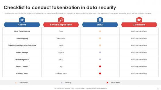 This slide showcases the checklist for performing tokenization. The purpose of this slide is to highlight the actions performed while conducting regression testing, person responsible, status and comments for the same. Boost your pitch with our creative Checklist To Conduct Tokenization In Data Security PPT Presentation. Deliver an awe-inspiring pitch that will mesmerize everyone. Using these presentation templates you will surely catch everyones attention. You can browse the ppts collection on our website. We have researchers who are experts at creating the right content for the templates. So you do not have to invest time in any additional work. Just grab the template now and use them. This slide showcases the checklist for performing tokenization. The purpose of this slide is to highlight the actions performed while conducting regression testing, person responsible, status and comments for the same.