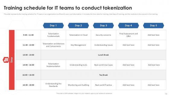 This slide represents the training schedule for IT teams in an organization to efficiently carry out tokenization. It includes the time slots for training, total days of training, and the modules to be covered in the training. If you are looking for a format to display your unique thoughts, then the professionally designed Training Schedule For It Teams To Conduct Tokenization Securing Your Data Ppt Presentation is the one for you. You can use it as a Google Slides template or a PowerPoint template. Incorporate impressive visuals, symbols, images, and other charts. Modify or reorganize the text boxes as you desire. Experiment with shade schemes and font pairings. Alter, share or cooperate with other people on your work. Download Training Schedule For It Teams To Conduct Tokenization Securing Your Data Ppt Presentation and find out how to give a successful presentation. Present a perfect display to your team and make your presentation unforgettable. This slide represents the training schedule for IT teams in an organization to efficiently carry out tokenization. It includes the time slots for training, total days of training, and the modules to be covered in the training.