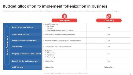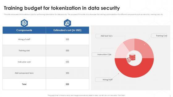 This slide showcases the breakdown cost for performing tokenization for data security. The purpose of this slide is to showcase the training cost breakdown for different components such as instructor, training cost, etc. Find a pre-designed and impeccable Training Budget For Tokenization In Data Security PPT Template. The templates can ace your presentation without additional effort. You can download these easy-to-edit presentation templates to make your presentation stand out from others. So, what are you waiting for Download the template from Slidegeeks today and give a unique touch to your presentation. This slide showcases the breakdown cost for performing tokenization for data security. The purpose of this slide is to showcase the training cost breakdown for different components such as instructor, training cost, etc.
