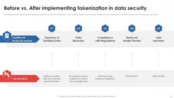This slide showcases the comparative analysis of the before versus after tokenization. The purpose of this slide is to showcase the different performance metrics and how tokenization has improved these metrics. Find a pre-designed and impeccable Before Vs After Implementing Tokenization In Data Security PPT Template. The templates can ace your presentation without additional effort. You can download these easy-to-edit presentation templates to make your presentation stand out from others. So, what are you waiting for Download the template from Slidegeeks today and give a unique touch to your presentation. This slide showcases the comparative analysis of the before versus after tokenization. The purpose of this slide is to showcase the different performance metrics and how tokenization has improved these metrics.