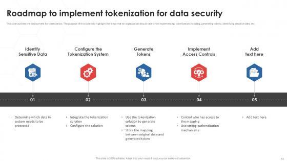 This slide outlines the deployment for tokenization. The purpose of this slide is to highlight the steps that an organization should take while implementing tokenization including, generating tokens, identifying sensitive data, etc. Boost your pitch with our creative Roadmap To Implement Tokenization For Data Security PPT Presentation. Deliver an awe-inspiring pitch that will mesmerize everyone. Using these presentation templates you will surely catch everyones attention. You can browse the ppts collection on our website. We have researchers who are experts at creating the right content for the templates. So you do not have to invest time in any additional work. Just grab the template now and use them. This slide outlines the deployment for tokenization. The purpose of this slide is to highlight the steps that an organization should take while implementing tokenization including, generating tokens, identifying sensitive data, etc.