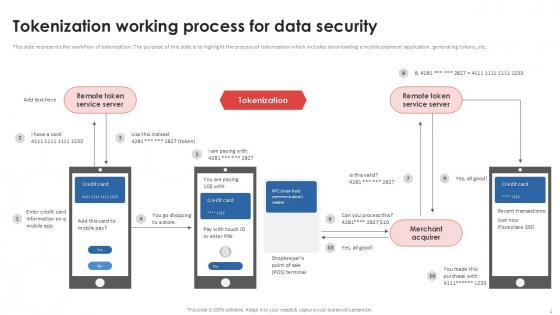 This slide represents the workflow of tokenization. The purpose of this slide is to highlight the process of tokenization which includes downloading a mobile payment application, generating tokens, etc. Find highly impressive Tokenization Working Process For Data Security Securing Your Data Ppt Presentation on Slidegeeks to deliver a meaningful presentation. You can save an ample amount of time using these presentation templates. No need to worry to prepare everything from scratch because Slidegeeks experts have already done a huge research and work for you. You need to download Tokenization Working Process For Data Security Securing Your Data Ppt Presentation for your upcoming presentation. All the presentation templates are 100 percent editable and you can change the color and personalize the content accordingly. Download now This slide represents the workflow of tokenization. The purpose of this slide is to highlight the process of tokenization which includes downloading a mobile payment application, generating tokens, etc.