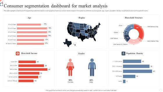 This slide highlights a dashboard for segmenting customers based on demographics factors to conduct market research. It includes key elements such as gender, age, region, population density, household structure and household income. Showcasing this set of slides titled Consumer Segmentation Dashboard For Market Analysis Structure Pdf. The topics addressed in these templates are Consumer Segmentation Dashboard, Market Analysis, Household Structure. All the content presented in this PPT design is completely editable. Download it and make adjustments in color, background, font etc. as per your unique business setting. This slide highlights a dashboard for segmenting customers based on demographics factors to conduct market research. It includes key elements such as gender, age, region, population density, household structure and household income.