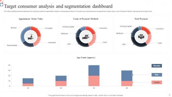 The following slide presents a dashboard for analyzing customer segmentation based on demographics factors. It includes key components such as appointment status value, count of payment method, total payments and age count. Slidegeeks is here to make your presentations a breeze with Target Customer Analysis And Segmentation Dashboard Ppt Portfolio Example Topics PDF With our easy to use and customizable templates, you can focus on delivering your ideas rather than worrying about formatting. With a variety of designs to choose from, you are sure to find one that suits your needs. And with animations and unique photos, illustrations, and fonts, you can make your presentation pop. So whether you are giving a sales pitch or presenting to the board, make sure to check out Slidegeeks first.