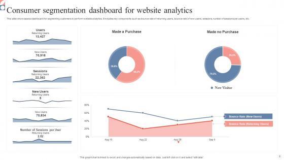 This slide showcases a dashboard for segmenting customers to perform website analytics. It includes key components such as bounce rate of returning users, bounce rate of new users, sessions, number of sessions per users, etc. Pitch your topic with ease and precision using this Consumer Segmentation Dashboard For Website Analytics Infographics Pdf. This layout presents information on Consumer Segmentation Dashboard, Website Analytics, Segmenting Customers. It is also available for immediate download and adjustment. So, changes can be made in the color, design, graphics or any other component to create a unique layout. This slide showcases a dashboard for segmenting customers to perform website analytics. It includes key components such as bounce rate of returning users, bounce rate of new users, sessions, number of sessions per users, etc.
