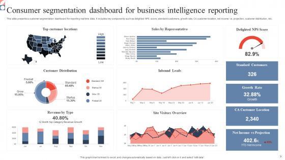 This slide presents a customer segmentation dashboard for reporting real time data. It includes key components such as delighted NPS score, standard customers, growth rate, CA customer location, net income vs. projection, customer distribution, etc. Pitch your topic with ease and precision using this Consumer Segmentation Dashboard For Business Intelligence Reporting Topics Pdf. This layout presents information on Consumer Segmentation Dashboard, Business Intelligence Reporting, Growth Rate. It is also available for immediate download and adjustment. So, changes can be made in the color, design, graphics or any other component to create a unique layout. This slide presents a customer segmentation dashboard for reporting real time data. It includes key components such as delighted NPS score, standard customers, growth rate, CA customer location, net income vs. projection, customer distribution, etc.