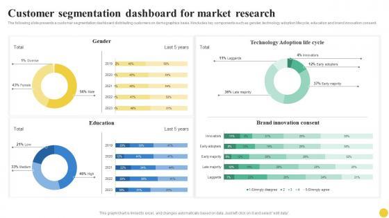 The following slide presents a customer segmentation dashboard distributing customers on demographics basis. It includes key components such as gender, technology adoption lifecycle, education and brand innovation consent. Do you have to make sure that everyone on your team knows about any specific topic I yes, then you should give Customer Segmentation Dashboard For Market Research Guide For Segmenting And Formulating Designs Pdf a try. Our experts have put a lot of knowledge and effort into creating this impeccable Customer Segmentation Dashboard For Market Research Guide For Segmenting And Formulating Designs Pdf. You can use this template for your upcoming presentations, as the slides are perfect to represent even the tiniest detail. You can download these templates from the Slidegeeks website and these are easy to edit. So grab these today. The following slide presents a customer segmentation dashboard distributing customers on demographics basis. It includes key components such as gender, technology adoption lifecycle, education and brand innovation consent.
