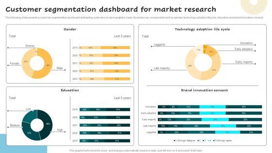 The following slide presents a customer segmentation dashboard distributing customers on demographics basis. It includes key components such as gender, technology adoption lifecycle, education and brand innovation consent. Find a pre designed and impeccable Customer Segmentation Dashboard For Market Research Ppt Portfolio Format PDF. The templates can ace your presentation without additional effort. You can download these easy to edit presentation templates to make your presentation stand out from others. So, what are you waiting for Download the template from Slidegeeks today and give a unique touch to your presentation.