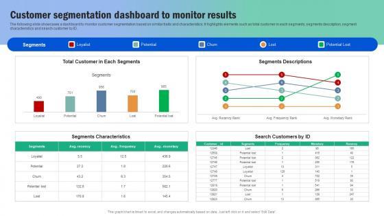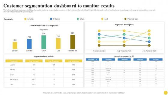 The following slide showcases a dashboard to monitor customer segmentation based on similar traits and characteristics. It highlights elements such as total customer in each segments, segments description, segment characteristics and search customer by ID. Formulating a presentation can take up a lot of effort and time, so the content and message should always be the primary focus. The visuals of the PowerPoint can enhance the presenters message, so our Customer Segmentation Dashboard To Monitor Results Ppt PowerPoint Presentation File Deck PDF was created to help save time. Instead of worrying about the design, the presenter can concentrate on the message while our designers work on creating the ideal templates for whatever situation is needed. Slidegeeks has experts for everything from amazing designs to valuable content, we have put everything into Customer Segmentation Dashboard To Monitor Results Ppt PowerPoint Presentation File Deck PDF.