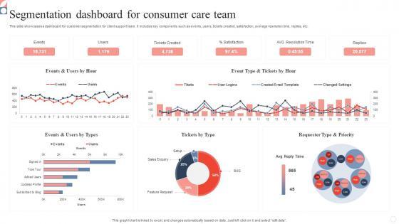 This slide showcases a dashboard for customer segmentation for client support team. It includes key components such as events, users, tickets created, satisfaction, average resolution time, replies, etc. Showcasing this set of slides titled Segmentation Dashboard For Consumer Care Team Slides Pdf. The topics addressed in these templates are Segmentation Dashboard, Consumer Care Team, Satisfaction. All the content presented in this PPT design is completely editable. Download it and make adjustments in color, background, font etc. as per your unique business setting. This slide showcases a dashboard for customer segmentation for client support team. It includes key components such as events, users, tickets created, satisfaction, average resolution time, replies, etc.