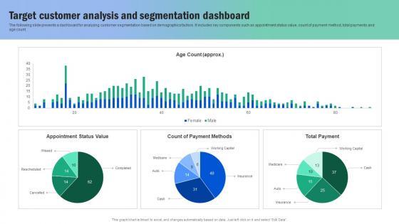 The following slide presents a dashboard for analyzing customer segmentation based on demographics factors. It includes key components such as appointment status value, count of payment method, total payments and age count. Formulating a presentation can take up a lot of effort and time, so the content and message should always be the primary focus. The visuals of the PowerPoint can enhance the presenters message, so our Target Customer Analysis And Segmentation Guide For Segmenting And Formulating Topics Pdf was created to help save time. Instead of worrying about the design, the presenter can concentrate on the message while our designers work on creating the ideal templates for whatever situation is needed. Slidegeeks has experts for everything from amazing designs to valuable content, we have put everything into Target Customer Analysis And Segmentation Guide For Segmenting And Formulating Topics Pdf. The following slide presents a dashboard for analyzing customer segmentation based on demographics factors. It includes key components such as appointment status value, count of payment method, total payments and age count.
