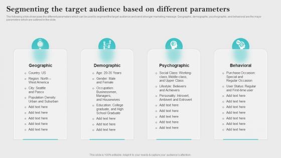 The following slide showcases the different parameters which can be used to segment the target audience and send stronger marketing message. Geographic, demographic, psychographic, and behavioral are the major parameters which are outlined in the slide. Slidegeeks is one of the best resources for PowerPoint templates. You can download easily and regulate Segmenting The Target Audience Innovative Business Promotion Ideas Template Pdf for your personal presentations from our wonderful collection. A few clicks is all it takes to discover and get the most relevant and appropriate templates. Use our Templates to add a unique zing and appeal to your presentation and meetings. All the slides are easy to edit and you can use them even for advertisement purposes. The following slide showcases the different parameters which can be used to segment the target audience and send stronger marketing message. Geographic, demographic, psychographic, and behavioral are the major parameters which are outlined in the slide.