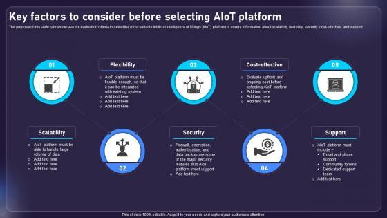 The purpose of this slide is to showcase the evaluation criteria to select the most suitable Artificial Intelligence of Things AIoT platform. It covers information about scalability, flexibility, security, cost-effective, and support. Are you searching for a Key Factors To Consider Before Selecting AIOT Platform AIOT Applications For Various Industries IoT SS V that is uncluttered, straightforward, and original Its easy to edit, and you can change the colors to suit your personal or business branding. For a presentation that expresses how much effort you have put in, this template is ideal With all of its features, including tables, diagrams, statistics, and lists, its perfect for a business plan presentation. Make your ideas more appealing with these professional slides. Download Key Factors To Consider Before Selecting AIOT Platform AIOT Applications For Various Industries IoT SS V from Slidegeeks today. The purpose of this slide is to showcase the evaluation criteria to select the most suitable Artificial Intelligence of Things AIoT platform. It covers information about scalability, flexibility, security, cost-effective, and support.