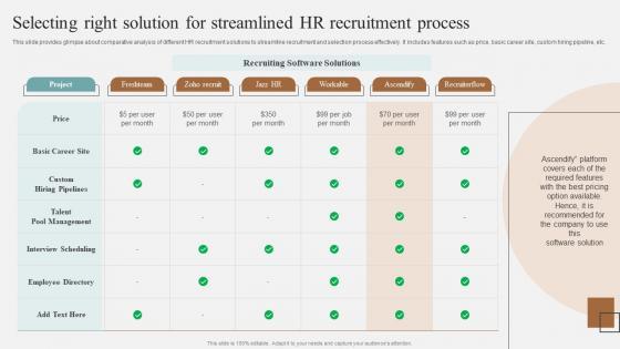 This slide provides glimpse about comparative analysis of different HR recruitment solutions to streamline recruitment and selection process effectively. It includes features such as price,basic career site,custom hiring pipeline,etc.Formulating a presentation can take up a lot of effort and time,so the content and message should always be the primary focus. The visuals of the PowerPoint can enhance the presenters message,so our Selecting Right Solution For Streamlined HR Enhancing Workforce Productivity Using HR Rules Pdf was created to help save time. Instead of worrying about the design,the presenter can concentrate on the message while our designers work on creating the ideal templates for whatever situation is needed. Slidegeeks has experts for everything from amazing designs to valuable content,we have put everything into Selecting Right Solution For Streamlined HR Enhancing Workforce Productivity Using HR Rules Pdf This slide provides glimpse about comparative analysis of different HR recruitment solutions to streamline recruitment and selection process effectively. It includes features such as price, basic career site, custom hiring pipeline,etc.