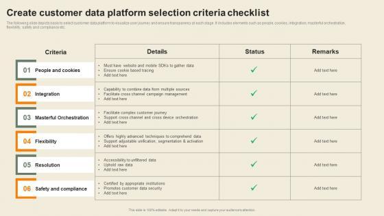 The following slide depicts basis to select customer data platform to visualize user journey and ensure transparency at each stage. It includes elements such as people, cookies, integration, masterful orchestration, flexibility, safety and compliance etc. Slidegeeks is here to make your presentations a breeze with Create Customer Data Platform Selection Usability Of CDP Software Tool Microsoft Pdf With our easy-to-use and customizable templates, you can focus on delivering your ideas rather than worrying about formatting. With a variety of designs to choose from, you are sure to find one that suits your needs. And with animations and unique photos, illustrations, and fonts, you can make your presentation pop. So whether you are giving a sales pitch or presenting to the board, make sure to check out Slidegeeks first The following slide depicts basis to select customer data platform to visualize user journey and ensure transparency at each stage. It includes elements such as people, cookies, integration, masterful orchestration, flexibility, safety and compliance etc.