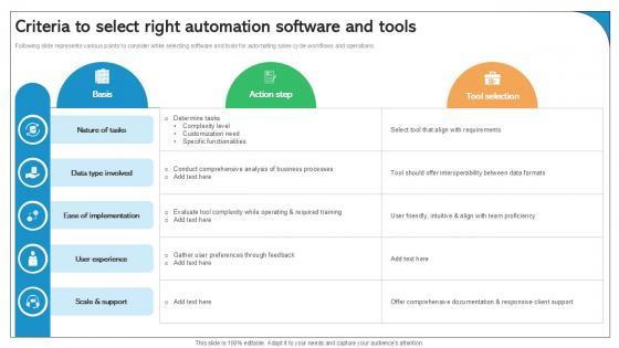 Following slide represents various points to consider while selecting software and tools for automating sales cycle workflows and operations. This modern and well-arranged Criteria To Select Right Automation Software And Tools Best Practices Ppt Example SA SS V provides lots of creative possibilities. It is very simple to customize and edit with the Powerpoint Software. Just drag and drop your pictures into the shapes. All facets of this template can be edited with Powerpoint, no extra software is necessary. Add your own material, put your images in the places assigned for them, adjust the colors, and then you can show your slides to the world, with an animated slide included. Following slide represents various points to consider while selecting software and tools for automating sales cycle workflows and operations.