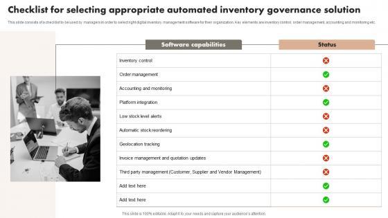 This slide consists of a checklist to be used by managers in order to select right digital inventory management software for their organization. Key elements are inventory control, order management, accounting and monitoring etc. Showcasing this set of slides titled Checklist For Selecting Appropriate Automated Inventory Governance Solution Slides Pdf. The topics addressed in these templates are Software capabilities, Status, solution. All the content presented in this PPT design is completely editable. Download it and make adjustments in color, background, font etc. as per your unique business setting. This slide consists of a checklist to be used by managers in order to select right digital inventory management software for their organization. Key elements are inventory control, order management, accounting and monitoring etc.