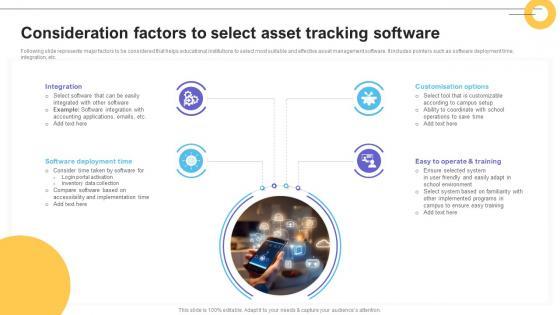 Following slide represents major factors to be considered that helps educational institutions to select most suitable and effective asset management software. It includes pointers such as software deployment time, integration, etc. Whether you have daily or monthly meetings, a brilliant presentation is necessary. Consideration Factors To Select Asset Tracking Software Impact Of IoT Technology On Education IoT SS V can be your best option for delivering a presentation. Represent everything in detail using Consideration Factors To Select Asset Tracking Software Impact Of IoT Technology On Education IoT SS V and make yourself stand out in meetings. The template is versatile and follows a structure that will cater to your requirements. All the templates prepared by Slidegeeks are easy to download and edit. Our research experts have taken care of the corporate themes as well. So, give it a try and see the results. Following slide represents major factors to be considered that helps educational institutions to select most suitable and effective asset management software. It includes pointers such as software deployment time, integration, etc.