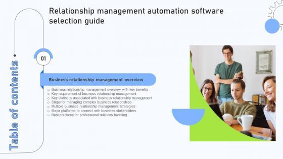 Are you in need of a template that can accommodate all of your creative concepts This one is crafted professionally and can be altered to fit any style. Use it with Google Slides or PowerPoint. Include striking photographs, symbols, depictions, and other visuals. Fill, move around, or remove text boxes as desired. Test out color palettes and font mixtures. Edit and save your work, or work with colleagues. Download Table Of Contents For Relationship Management Automation Software Selection Guide and observe how to make your presentation outstanding. Give an impeccable presentation to your group and make your presentation unforgettable. Our Table Of Contents For Relationship Management Automation Software Selection Guide are topically designed to provide an attractive backdrop to any subject. Use them to look like a presentation pro.
