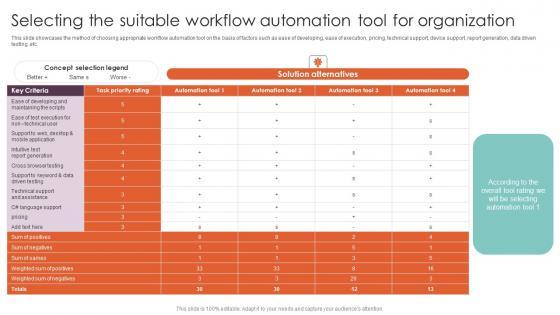 This slide showcases the method of choosing appropriate workflow automation tool on the basis of factors such as ease of developing, ease of execution, pricing, technical support, device support, report generation, data driven testing ,etc. Whether you have daily or monthly meetings, a brilliant presentation is necessary. Selecting The Suitable Workflow Automation Tool For Organization Demonstration PDF can be your best option for delivering a presentation. Represent everything in detail using Selecting The Suitable Workflow Automation Tool For Organization Demonstration PDF and make yourself stand out in meetings. The template is versatile and follows a structure that will cater to your requirements. All the templates prepared by Slidegeeks are easy to download and edit. Our research experts have taken care of the corporate themes as well. So, give it a try and see the results.