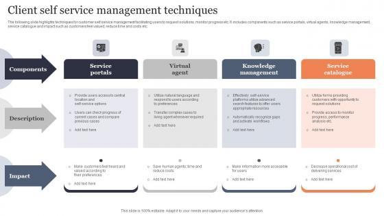 The following slide highlights techniques for customer self service management facilitating users to request solutions, monitor progress etc. It includes components such as service portals, virtual agents, knowledge management, service catalogue and impact such as customers feel valued, reduce time and costs etc. Showcasing this set of slides titled Client Self Service Management Techniques Themes Pdf. The topics addressed in these templates are Service Portals, Virtual Agent, Knowledge Management. All the content presented in this PPT design is completely editable. Download it and make adjustments in color, background, font etc. as per your unique business setting. The following slide highlights techniques for customer self service management facilitating users to request solutions, monitor progress etc. It includes components such as service portals, virtual agents, knowledge management, service catalogue and impact such as customers feel valued, reduce time and costs etc.