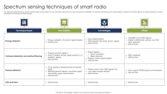 The slide showcases a technique of cognitive radio, i.e., spectrum sensing, and its further used techniques to eliminate technological issues faced in detecting usage of communication channels. The elements include energy detection, match filter, cyclostationery, waveform based processing, and so on. Showcasing this set of slides titled Spectrum Sensing Technique Of Smart Radio Topics Pdf. The topics addressed in these templates are Spectrum Sensing, Non Cooperative, Cooperative. All the content presented in this PPT design is completely editable. Download it and make adjustments in color, background, font etc. as per your unique business setting. The slide showcases a technique of cognitive radio, i.e., spectrum sensing, and its further used techniques to eliminate technological issues faced in detecting usage of communication channels. The elements include energy detection, match filter, cyclostationery, waveform based processing, and so on.