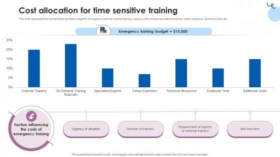This slide represents the cost structure and total budget for emergency customer service training. Various costs involved are external trainers, venue expenses, technical costs, etc. From laying roadmaps to briefing everything in detail, our templates are perfect for you. You can set the stage with your presentation slides. All you have to do is download these easy-to-edit and customizable templates. Cost Allocation For Time Sensitive Training Customer Service Training Ppt Slide will help you deliver an outstanding performance that everyone would remember and praise you for. Do download this presentation today. This slide represents the cost structure and total budget for emergency customer service training. Various costs involved are external trainers, venue expenses, technical costs, etc.