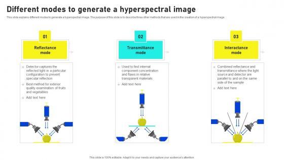 This slide explains different modes to generate a hyperspectral image. The purpose of this slide is to describe three other methods that are used in the creation of a hyperspectral image. Present like a pro with Different Modes To Generate Hyperspectral Imaging Sensors And Systems Themes Pdf Create beautiful presentations together with your team, using our easy to use presentation slides. Share your ideas in real time and make changes on the fly by downloading our templates. So whether you are in the office, on the go, or in a remote location, you can stay in sync with your team and present your ideas with confidence. With Slidegeeks presentation got a whole lot easier. Grab these presentations today. This slide explains different modes to generate a hyperspectral image. The purpose of this slide is to describe three other methods that are used in the creation of a hyperspectral image.
